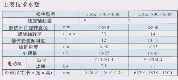 CXK型雙螺旋槽式洗礦(擦洗)機(jī)采用臥式雙軸反向轉(zhuǎn)動(dòng)的非連續(xù)槳葉形葉片。被擦洗物料在該機(jī)槽中經(jīng)水浸泡并在葉片強(qiáng)烈的切割、 沖擊下, 使黏土和礦物碎散、 解離, 同時(shí)可完成脫水、 脫泥作業(yè) 。 該機(jī)適合處理中等粒度含泥較多的難擦洗礦物 。